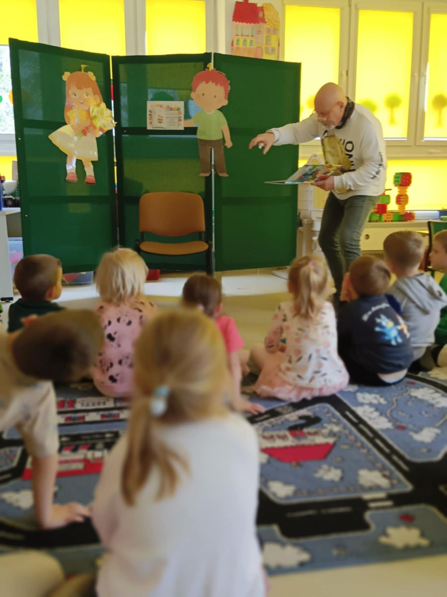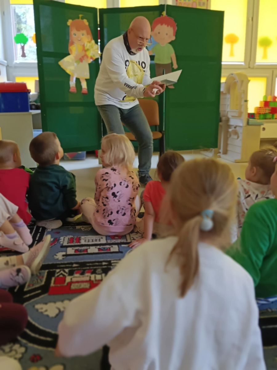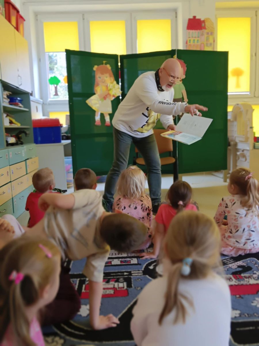 Dzieci uczestniczyły w spotkaniu z bajkoopowiadaczem – panem Mirkiem, pedagogiem specjalnym, który w barwny sposób czytał bajki. Wprowadzał najmłodszych w świat wyobraźni, angażując ich do wspólnego przeżywania opowieści.