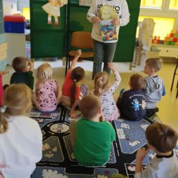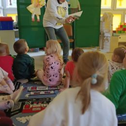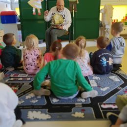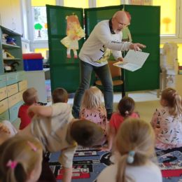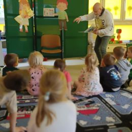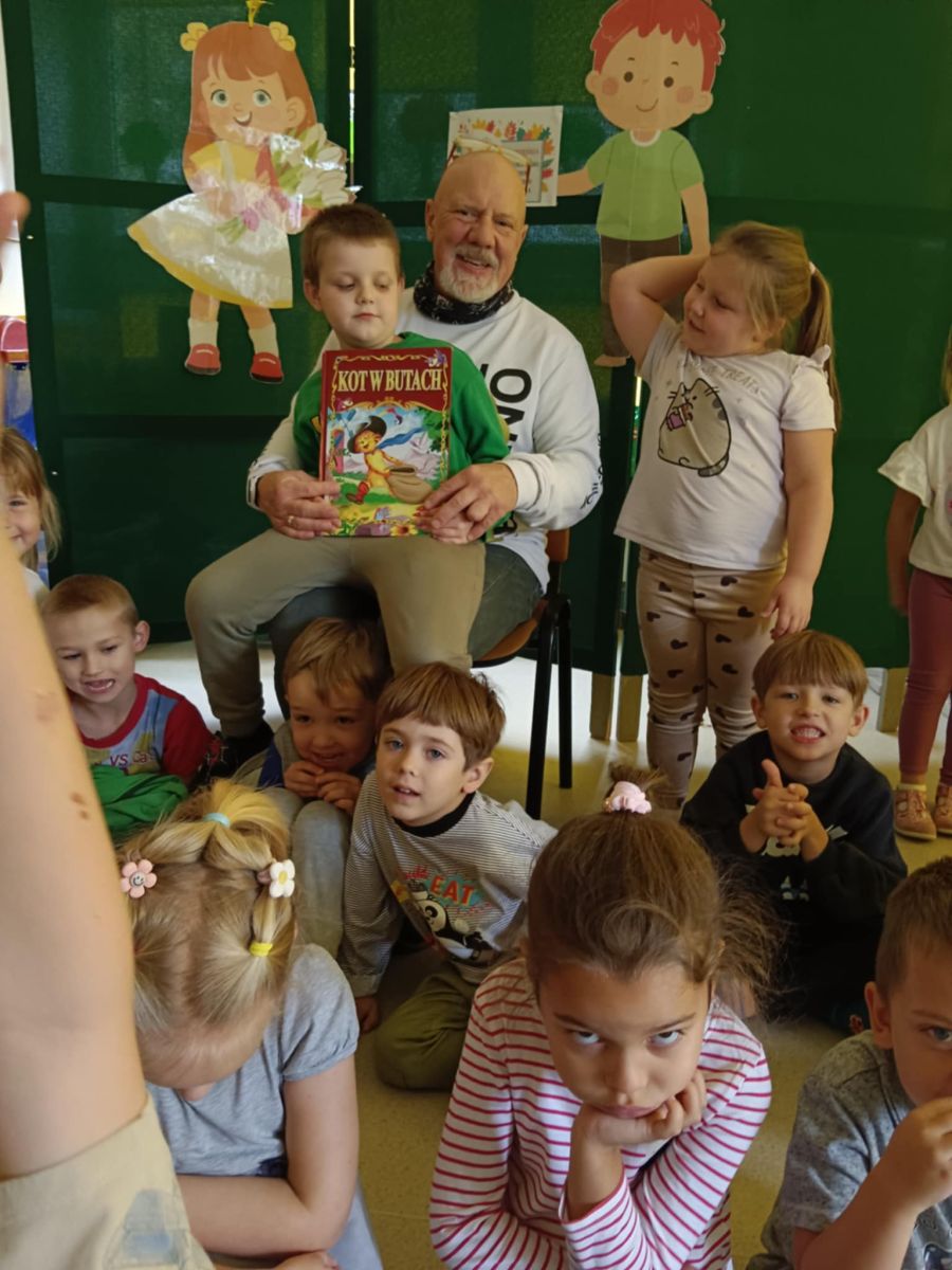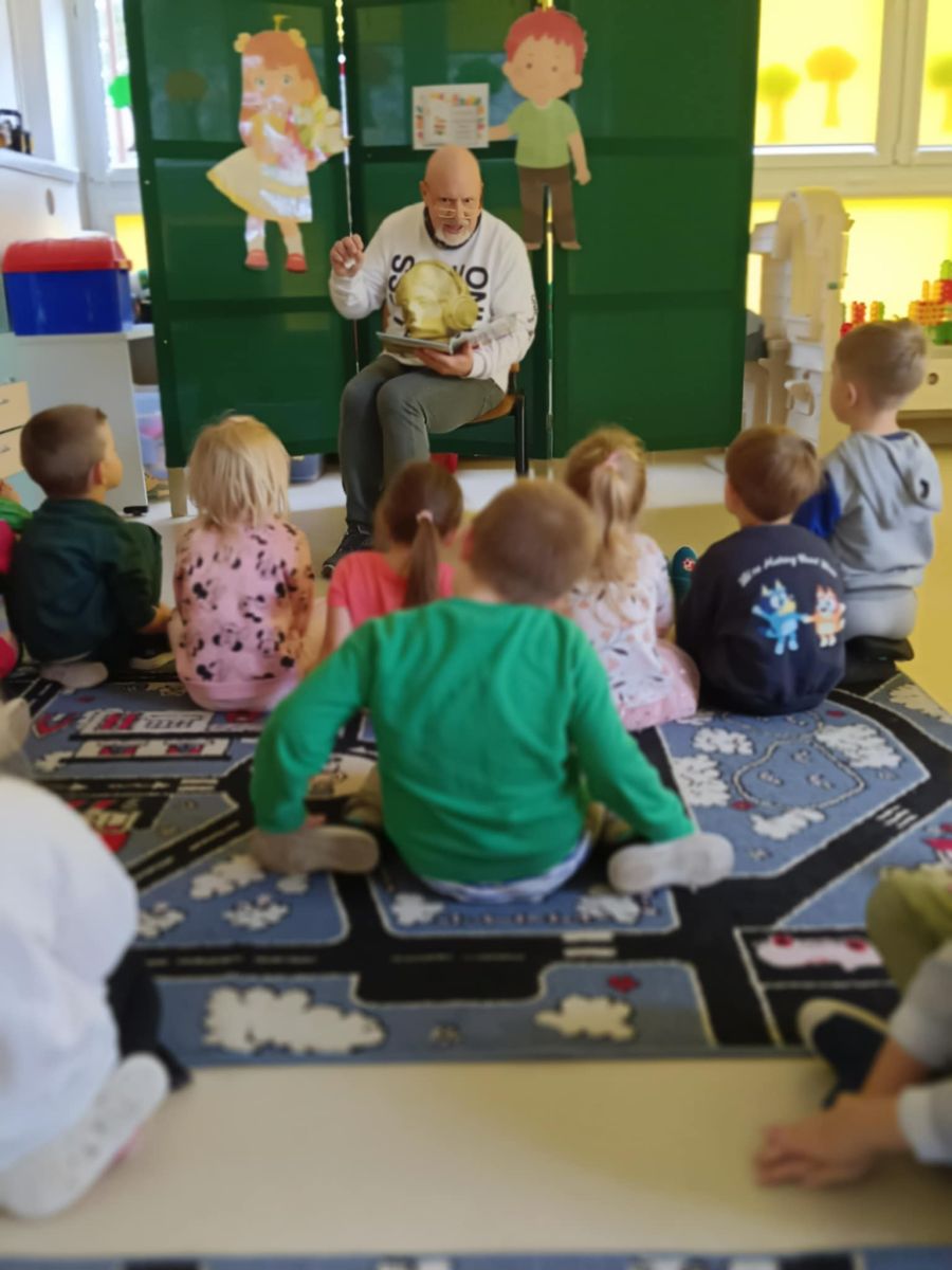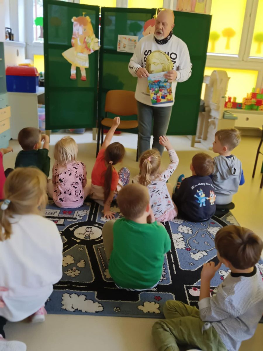 Dzieci uczestniczyły w spotkaniu z bajkoopowiadaczem – panem Mirkiem, pedagogiem specjalnym, który w barwny sposób czytał bajki. Wprowadzał najmłodszych w świat wyobraźni, angażując ich do wspólnego przeżywania opowieści.