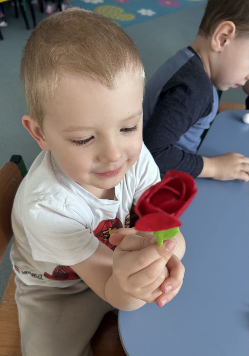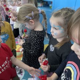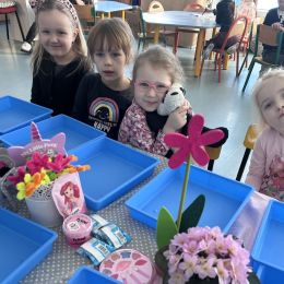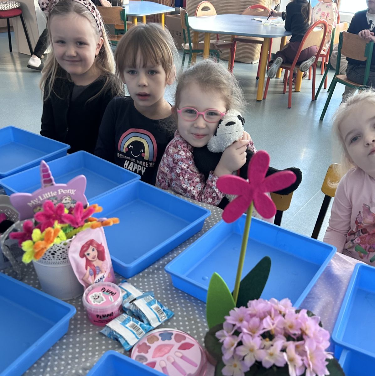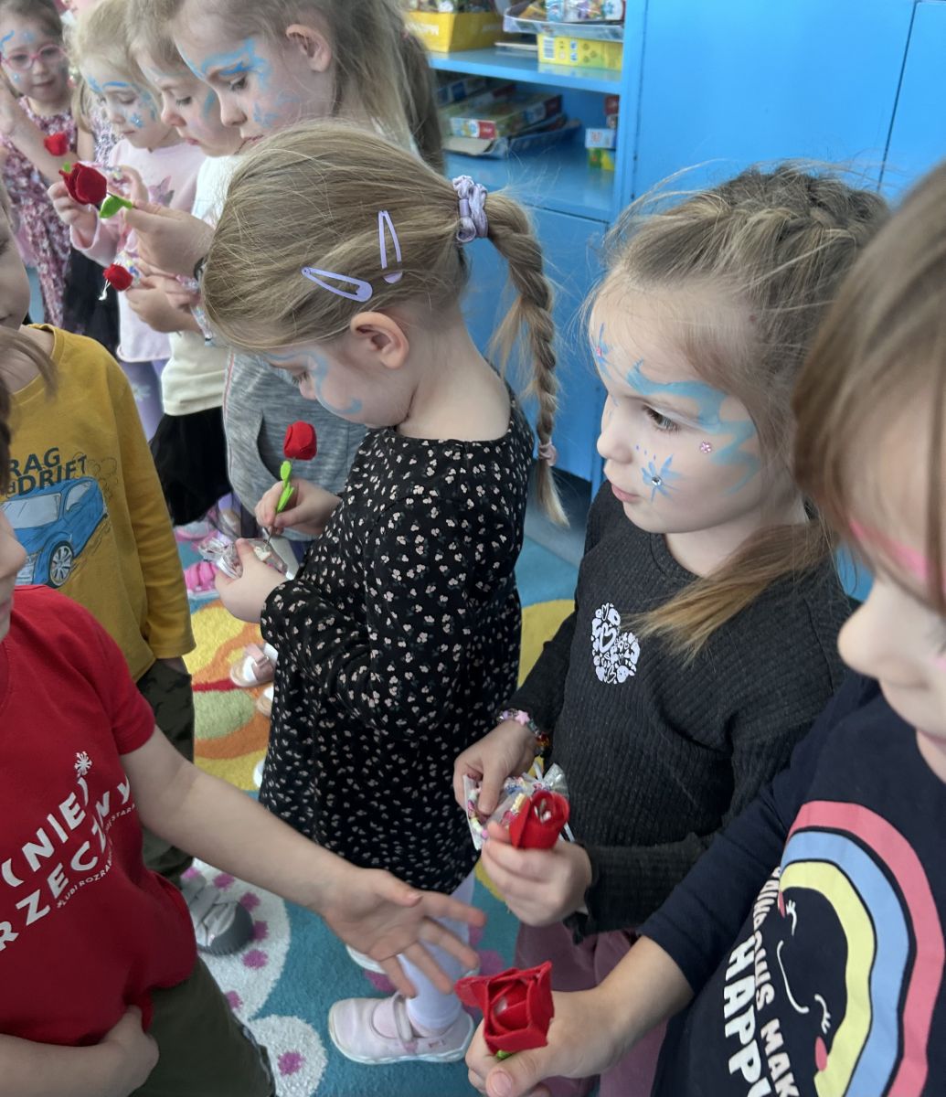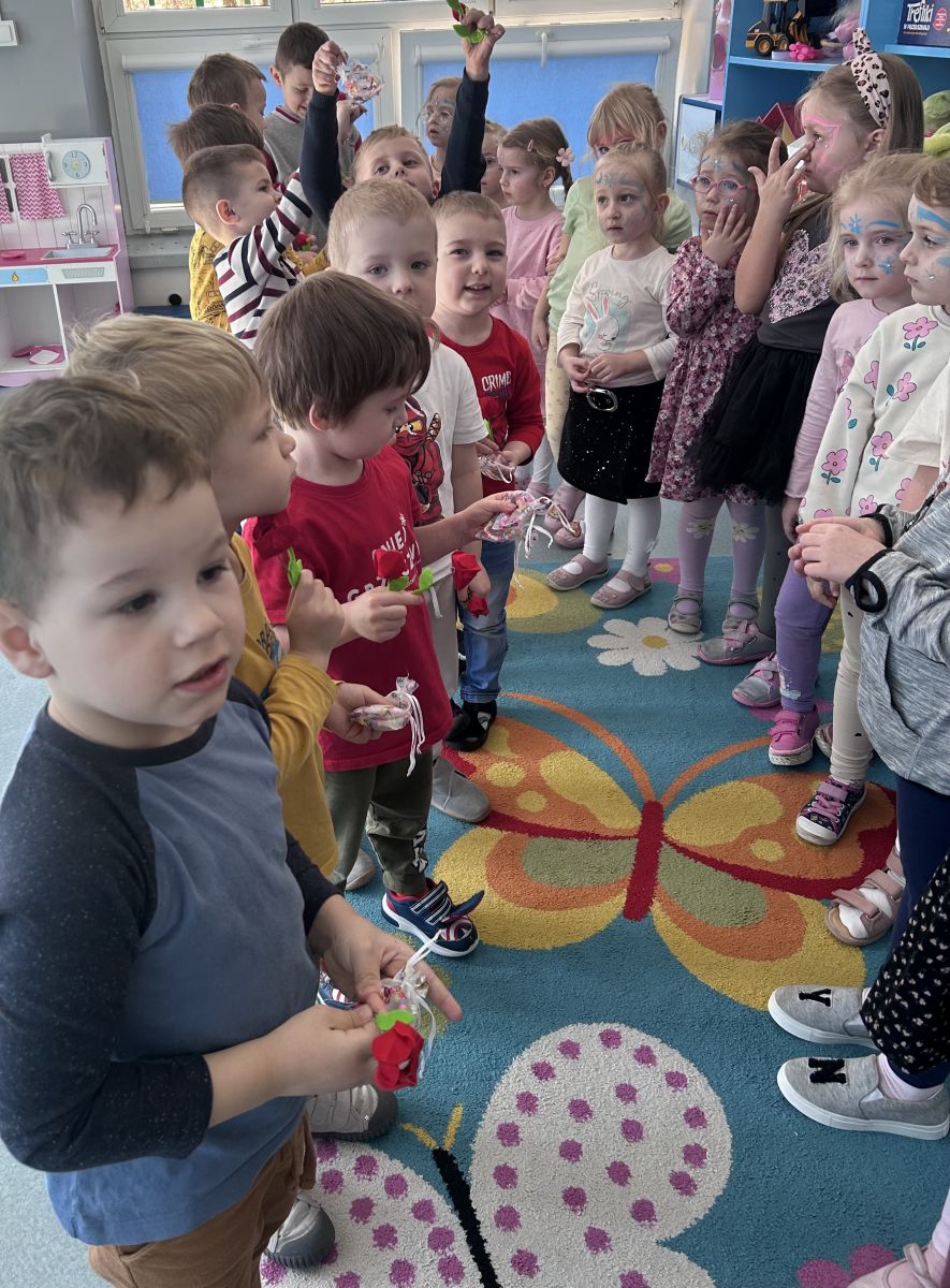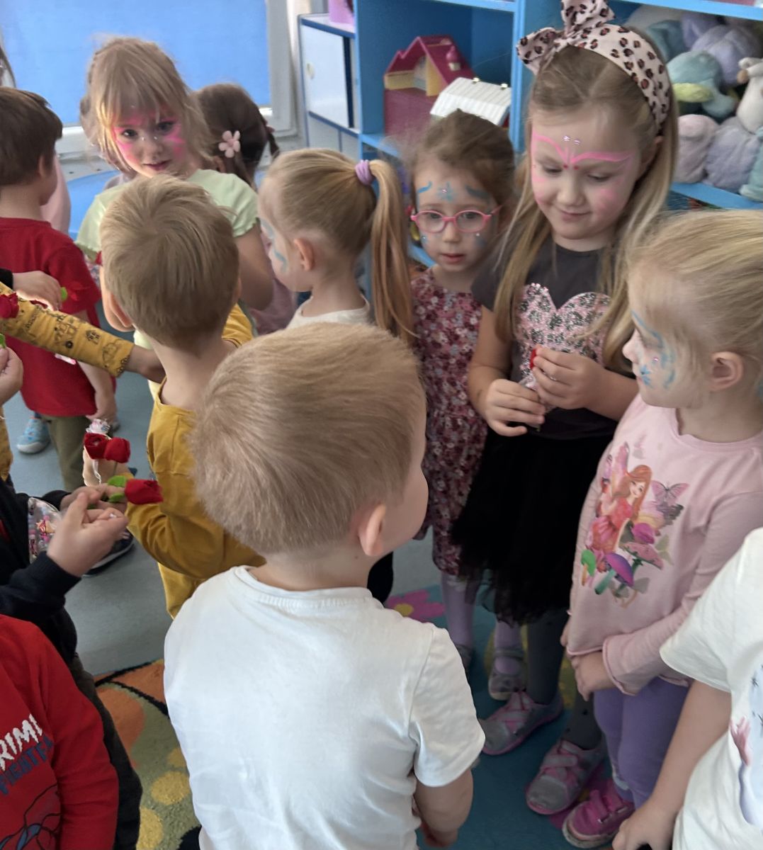 Dzień Kobiet upłynął w radosnej, pachnącej kwiatami, miłej atmosferze. Chłopcy wręczyli dziewczynkom kwiaty również te wykonane własnoręcznie, upominki oraz złożyli serdeczne życzenia. W grupie 2 na małe damy czekało „spa dla dłoni”, malowanie twarzy, a dziewczynki tworzyły kolorowe bransoletki z koralików. W starszych grupach to mali mężczyźni wykonali biżuterię dla koleżanek. Wspólna zabawa sprawiła wszystkim wiele radości i była okazją do okazania życzliwości oraz uprzejmości wobec innych. 🌷✨