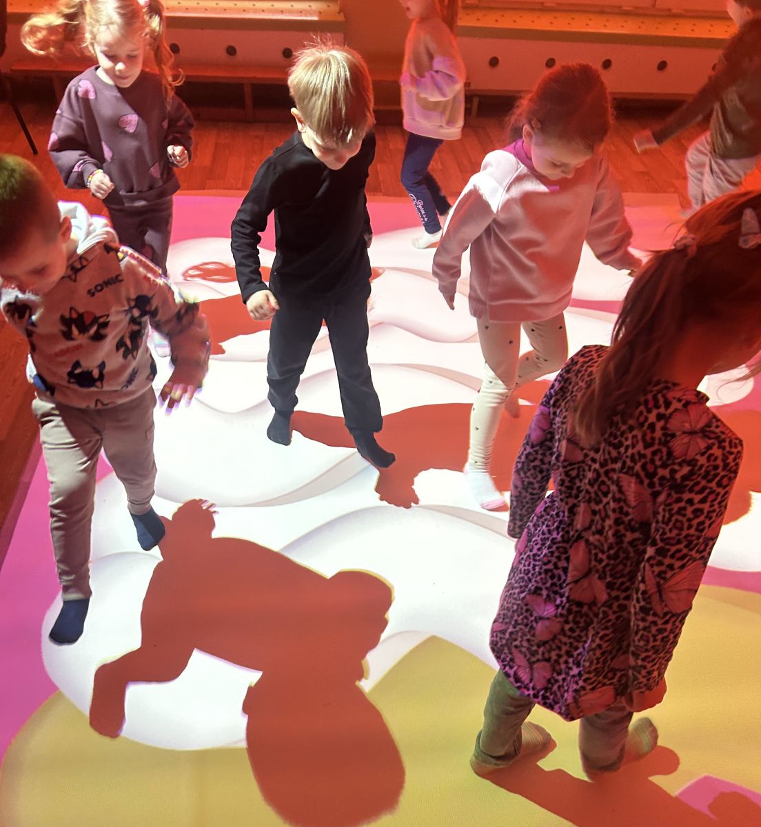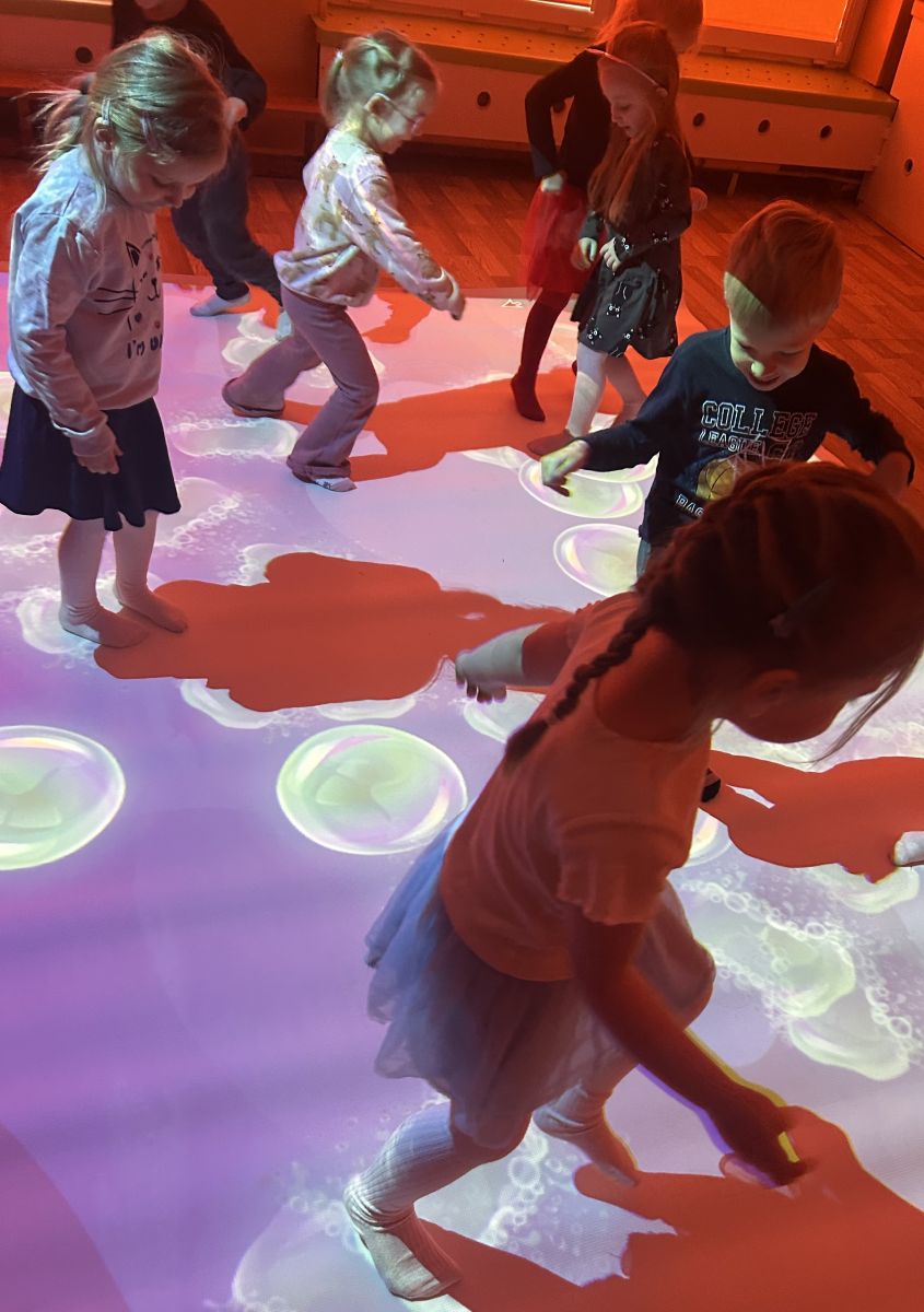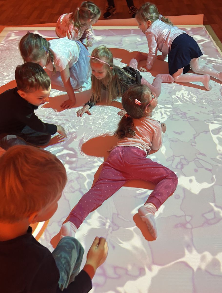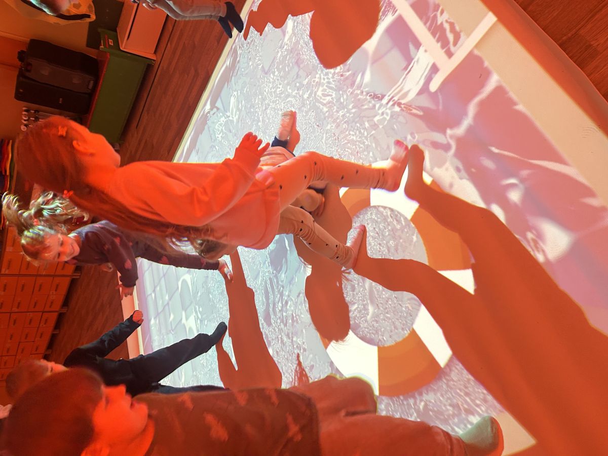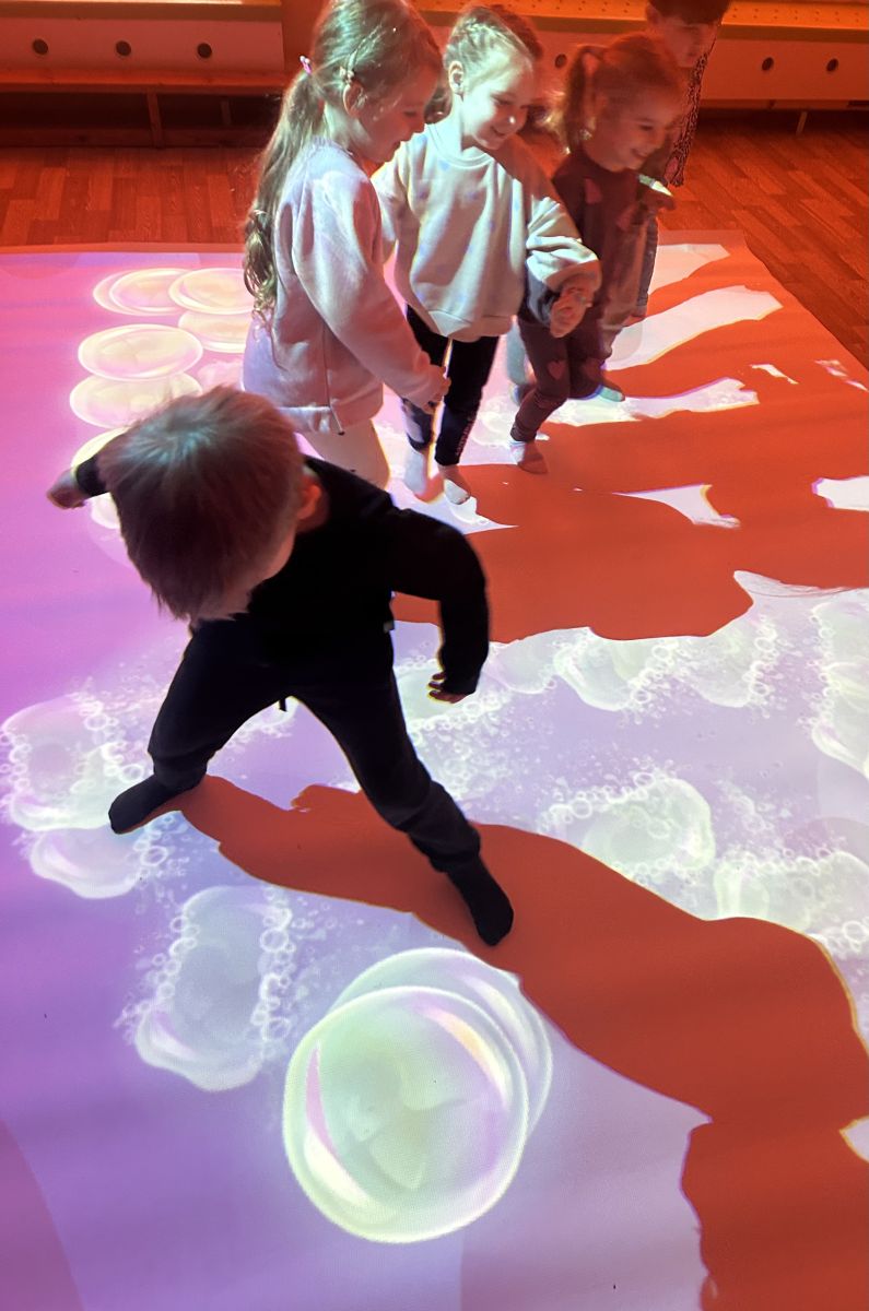✨ Zabawy z interaktywną podłogąDzieci zbijały wirtualne bańki, „pływały” w basenie, zapalały gwiazdy, ćwiczyły refleks oraz spostrzegawczość poprzez ruch i zabawę.