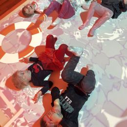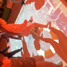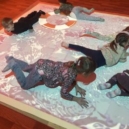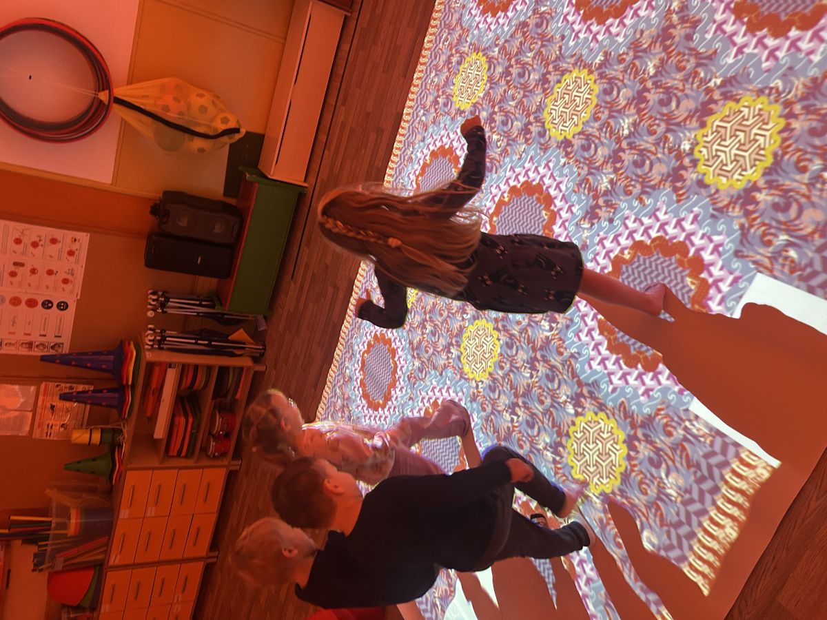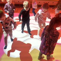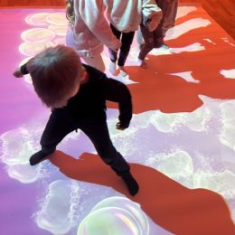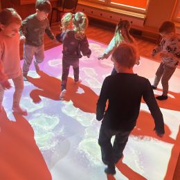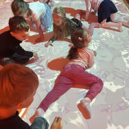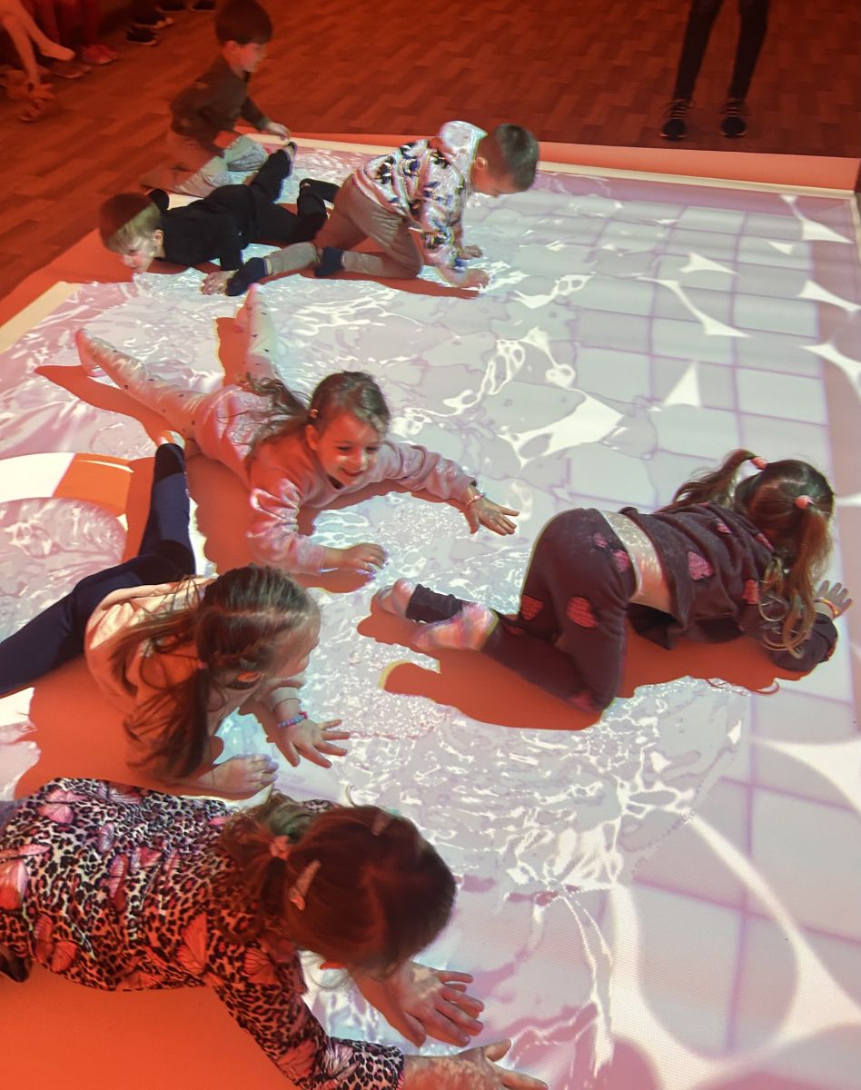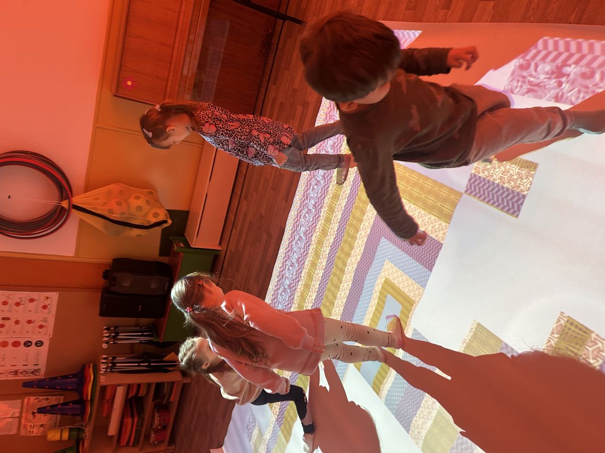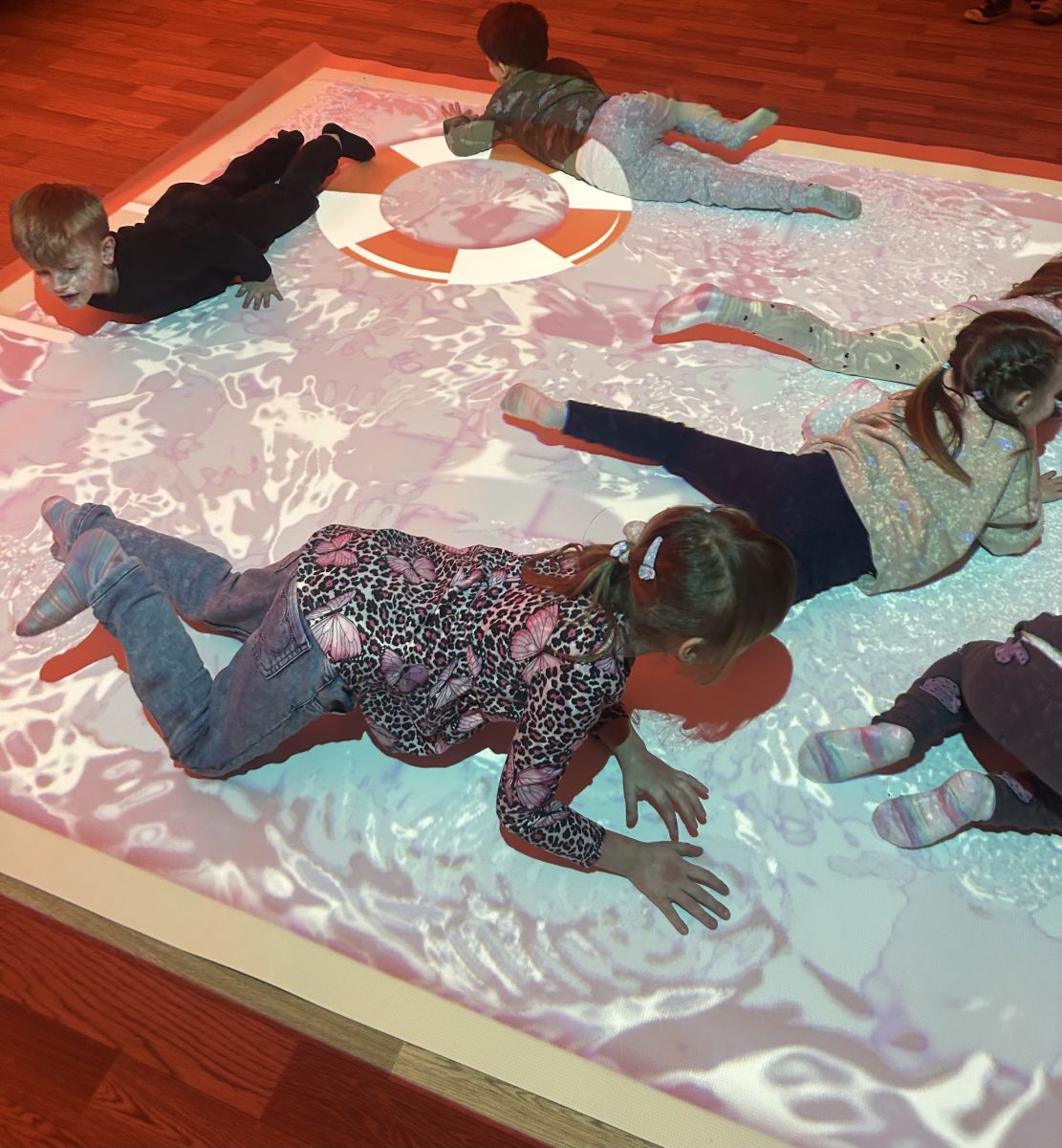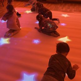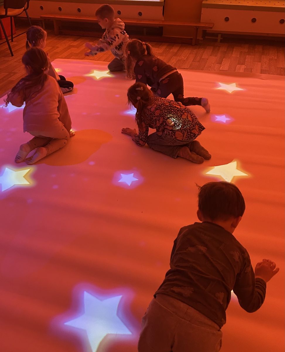 ✨ Zabawy z interaktywną podłogąDzieci zbijały wirtualne bańki, „pływały” w basenie, zapalały gwiazdy, ćwiczyły refleks oraz spostrzegawczość poprzez ruch i zabawę.