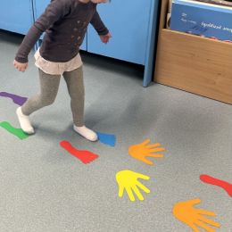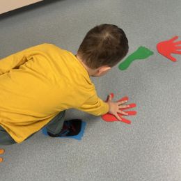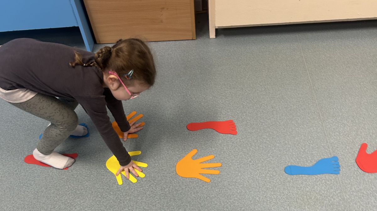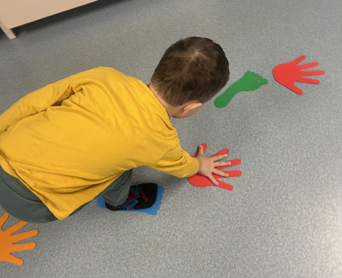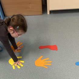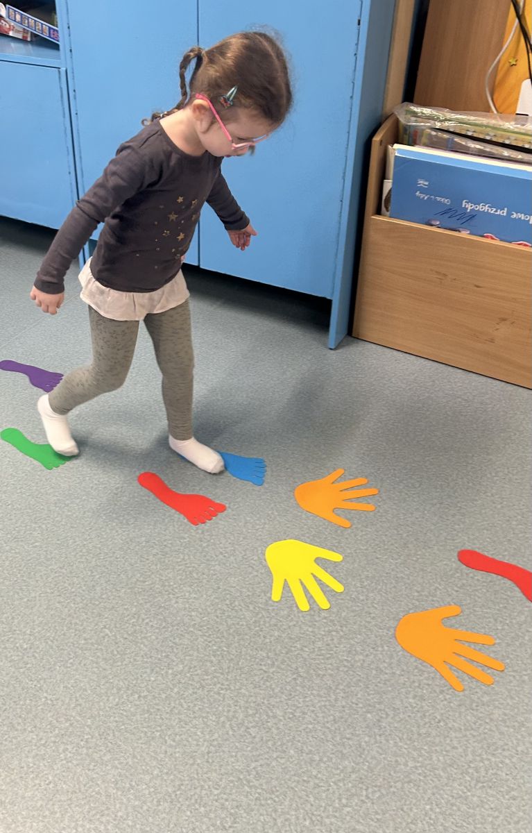 Dzieci doskonaliły koordynację ruchową, wykorzystując kolorowe kształtki stóp i rąk. Układały odpowiednie sekwencje, ćwiczyły równowagę, orientację w schemacie ciała oraz współpracę w grupie.