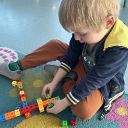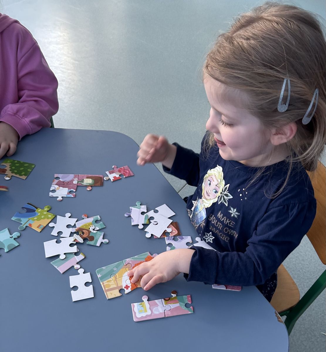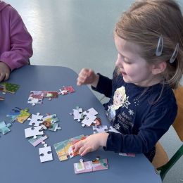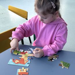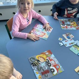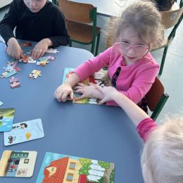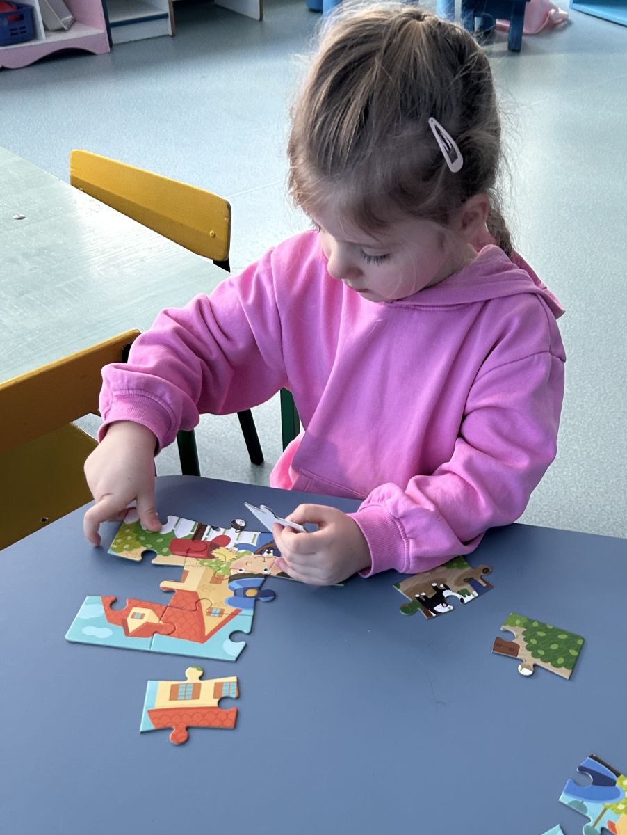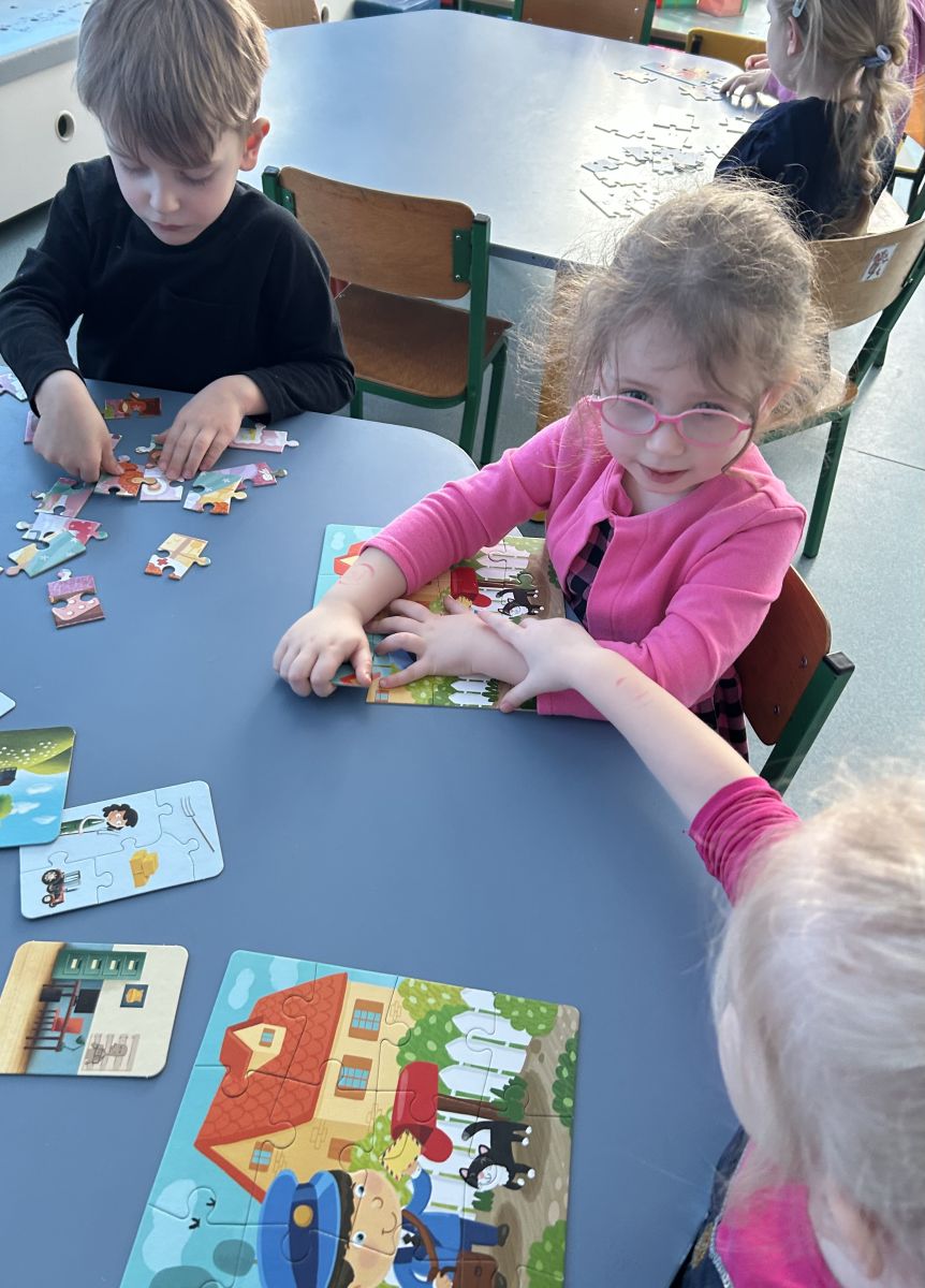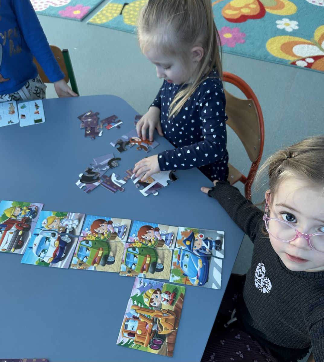 Utrwalaliśmy nazwy zawodów poprzez rozmowy i układanie puzzli przedstawiających różne profesje. Dzieci z zaangażowaniem dopasowywały elementy i opowiadały, czym zajmują się poszczególne osoby.